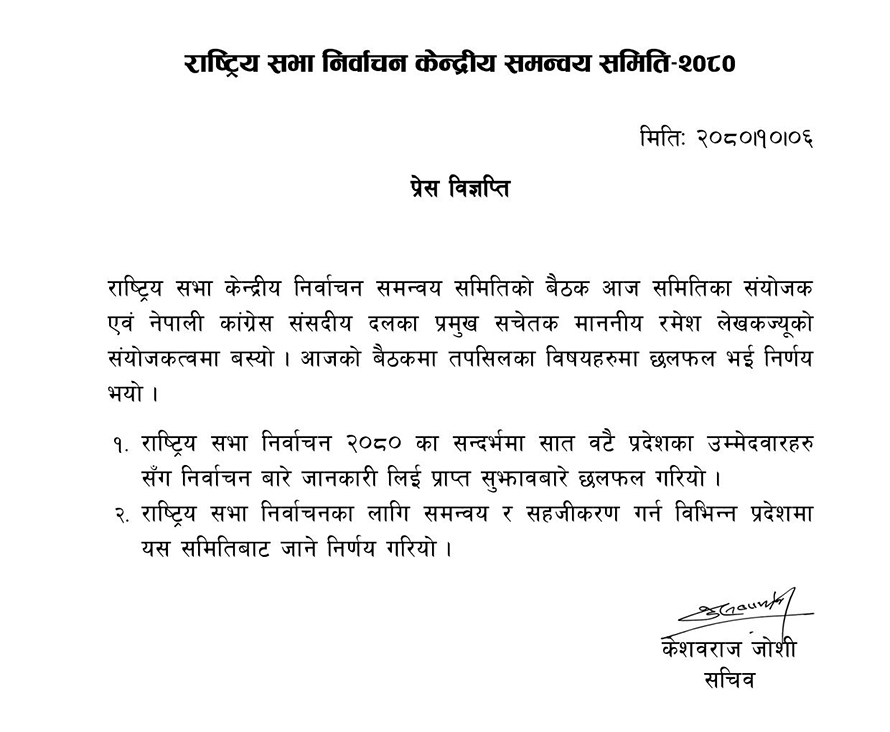 केन्द्रीय समन्वय समितिका संयोजक नेता रमेश लेखकको अध्यक्षताम बसेको बैठकमा ११ माघमा हुने राष्ट्रियसभा निर्वाचनमा पार्टीका उम्मेदवारहरुसँग छलफल भएको थियो । छलफलपछि समन्वय समितिको टोलीले प्रदेशस्तरमा जाने निर्णय गरेको हो ।